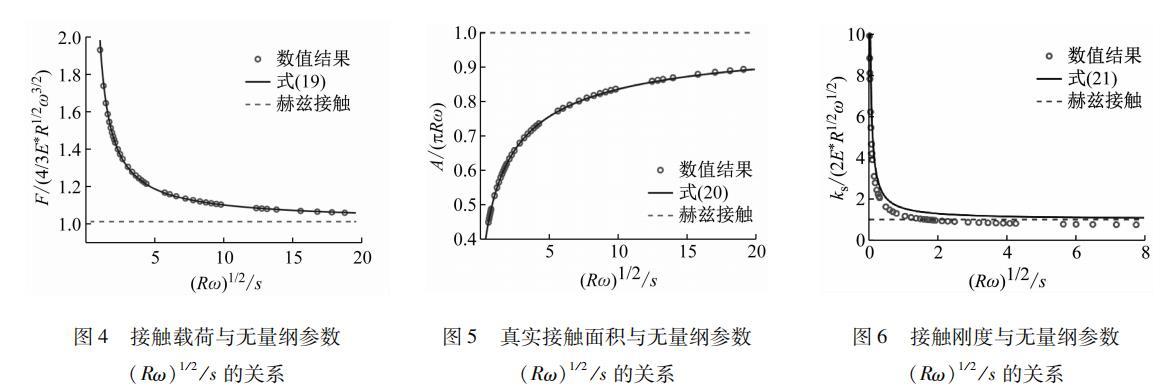 實際工程中不同粗糙表面對應(yīng)的微凸體曲率半徑各不相同,在上述的數(shù)值求解過程中,以微凸體曲率半徑R=10 mm為例來研究表面張力對接觸特性的影響,其他參數(shù)G=1 MPa, μ=0.4, β=0.1 J/m2。獲得了無量綱接觸載荷F/(4/3 E* R1/2 ω3/2)和無量綱接觸面積A/πRω與無量綱參數(shù)(Rω)1/2/s的數(shù)值關(guān)系,通過對數(shù)值解的擬合,得到了考慮表面張力時載荷F和真實接觸面積A與壓入深度ω的關(guān)系式分別如式(19)和式(20)所示,且不同的R值只會影響式(19)和式(20)中的擬合系數(shù)。