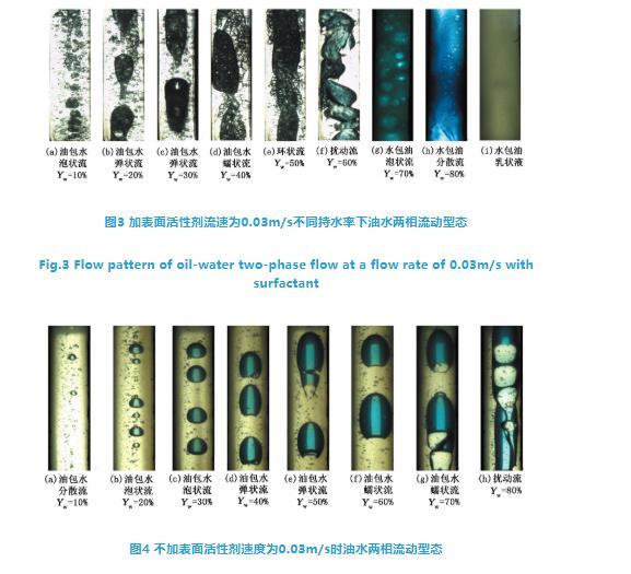 根據加入表面活性劑后不同流速、不同持水率下油水兩相垂直管流流態特征實驗結果,建立常溫常壓加劑后形成乳狀液之前油水兩相流動型態。