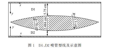 D1、D2 噴管為半弧形非對稱拉法爾噴管,喉部高度分別為 5.75 cm 和 2.484 cm,壁面曲率半徑分別為 70 cm 和 52.5 cm,坐標原點位于噴管進口位置,喉部位于 x=20 cm 處,如圖 1 所示。顯然,D2 噴管內的蒸汽膨脹速率大于 D1 噴管。