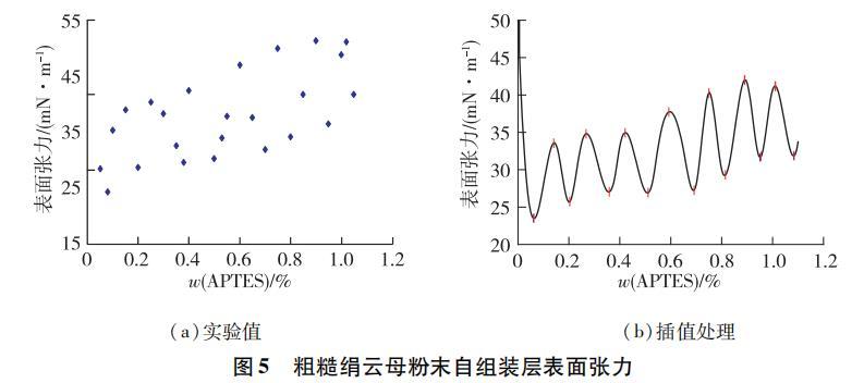 圖 5 粗糙絹云母粉末的表面張力 (a)實(shí)驗(yàn)值 (b) 插值