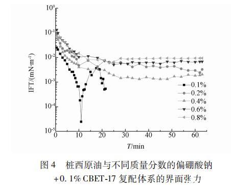 圖4 0.1% CBET-17/不同濃度偏硼酸鈉復(fù)配體系與樁西原油的界面張力