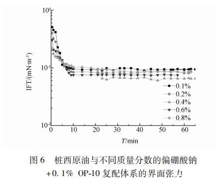 圖6 0.1% OP-10/不同濃度偏硼酸鈉復(fù)配體系與樁西原油的界面張力