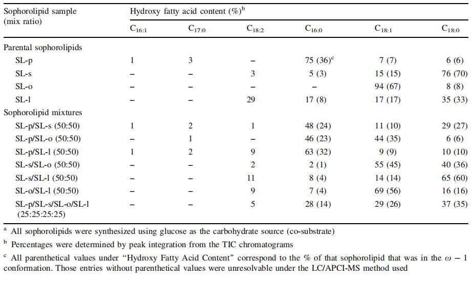 表1:通過LC/APCI MSa測定的由C.bombicola從棕櫚酸(SL-p)、硬脂酸(SL-s)、油酸(SL-o)、亞油酸(SL-l)酸生產的槐脂的結構含量(開鏈與內酯)