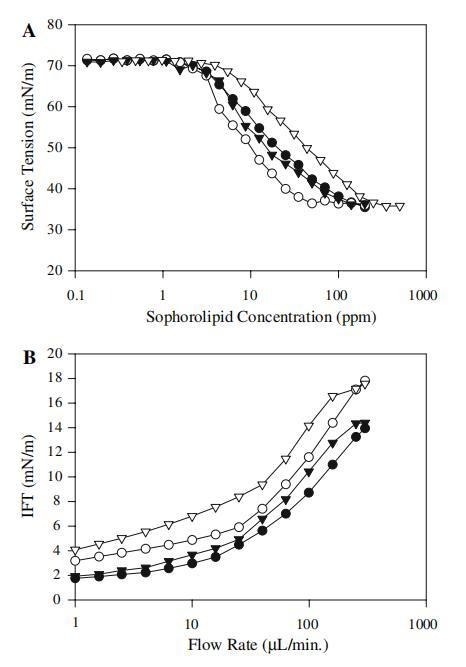 槐脂(SLs)相對較大的生產能力、可再生性和“生態友好性”有助于提高其作為家庭和個人護理產品中某些石化表面活性劑的添加劑或替代品的工業意義。 然而,為了考慮用于工業用途,SLs也必須廉價生產,并且必須了解和控制其物理性質,以便準確預測SLs在各種應用中的潛力。 表面張力(ST)、臨界膠束濃度(CMC)、界面張力(IFT)和水溶性是表面活性劑應用特別關注的四個性質。 理想情況下,良好的表面活性劑是水溶性的,表現出較低的CMC,并導致最小表面張力(min.ST)小于30 mN/m。 這些性質中的每一種都可以根據表面活性劑的化學組成進行控制。 通過在多種不同的混合基質(包括葡萄糖和4種不同的脂肪酸)上生長棉鈴蟲,我們產生了具有不同化學分布的SLs。 簡單地通過改變脂肪酸來生產不同的SLs的能力提供了在發酵水平上管理物理性質的前景,并通過在應用水平上以不同的比例混合SLs。