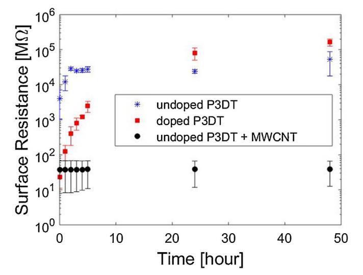 圖4。DOPEDP3DT、undopedP3DT和UNDOPEDMWCNT/P3DT單層電極的表面電阻隨時(shí)間的變化。