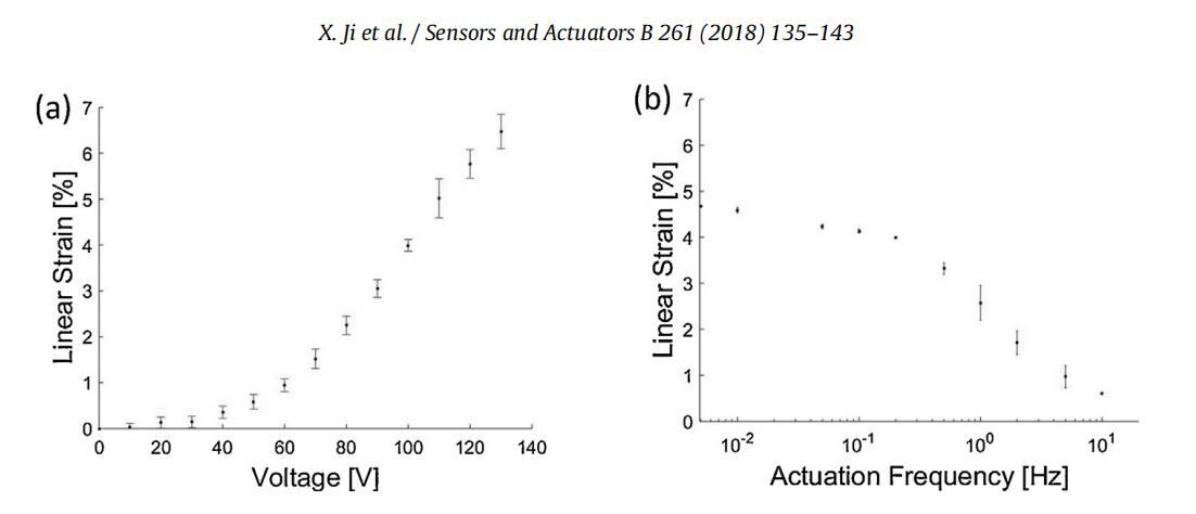 圖8。由1.4μm厚PDMS膜和單層電極組成的DEA的表征。(a)應(yīng)變與電壓曲線,顯示100V時(shí)約4%的線性應(yīng)變。(b)應(yīng)變與驅(qū)動(dòng)頻率曲線。