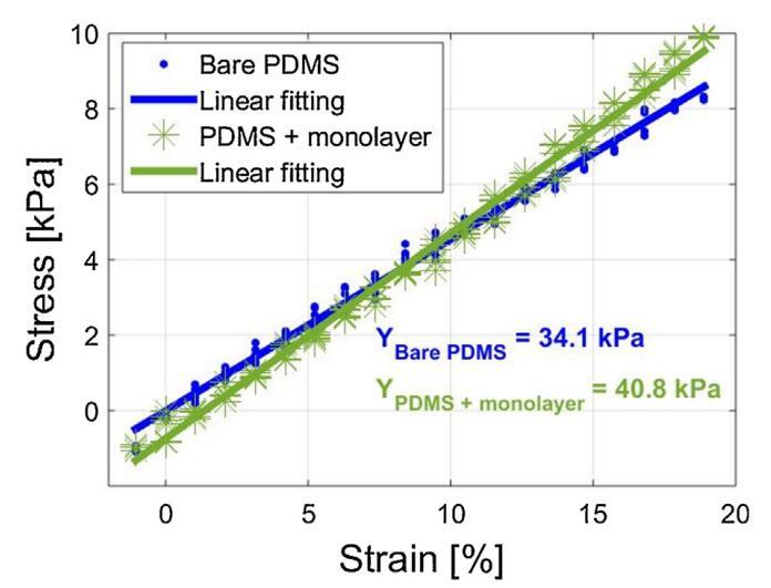 圖7。裸PDMS基板和覆蓋MWCNT/P3DT單層電極的相同PDMS基板的應(yīng)力-應(yīng)變曲線,允許測(cè)定單層剛度。