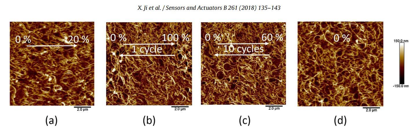 圖5。MWCNT/P3DT單層電極的AFM圖像。(a)在20%單軸應(yīng)變下。(b)在100%單軸應(yīng)變后恢復(fù)到0%應(yīng)變。(c)在10個(gè)周期后,以60%單軸應(yīng)變恢復(fù)到0%應(yīng)變。(d)在0%單軸應(yīng)變下,不施加任何應(yīng)變。箭頭指示拉伸方向。