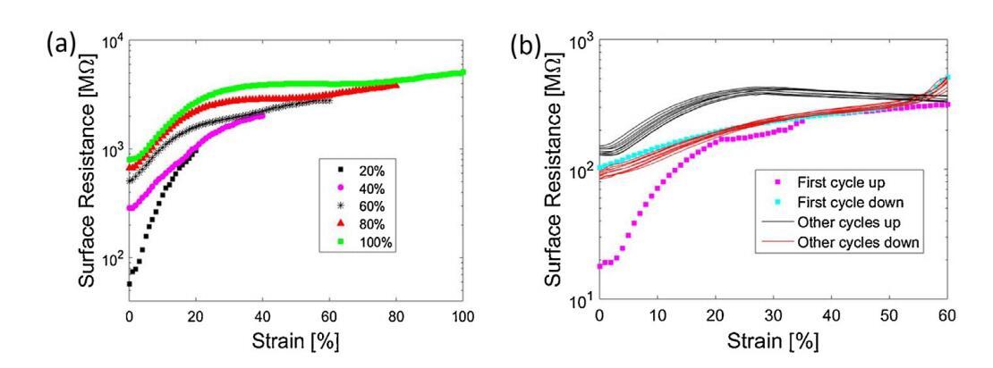 圖6a顯示了在20%和100%之間增加最大應(yīng)變的不同連續(xù)循環(huán)中,樣品表面電阻的變化。僅顯示拉伸循環(huán)。在前20%應(yīng)變期間,電阻增加約一個(gè)數(shù)量級(jí),表明MWCNT網(wǎng)絡(luò)內(nèi)的互連比降低。當(dāng)恢復(fù)到0%應(yīng)變時(shí),電阻沒有達(dá)到其初始值,而是增加了6倍。這突出了由于機(jī)械變形導(dǎo)致的電性能的不可逆變化。隨著最大施加應(yīng)變的增加,每個(gè)循環(huán)都會(huì)發(fā)生這種情況。然而,可以觀察到,在恢復(fù)到0%應(yīng)變后,表面電阻的增加在60%應(yīng)變以上不太明顯。值得注意的是,單層電極在100%單軸應(yīng)變下仍保持導(dǎo)電。