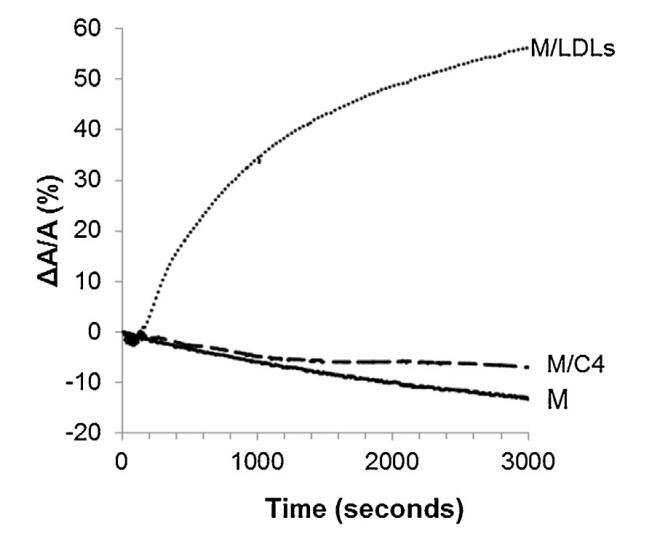將低密度脂蛋白和脂質體引入精子膜仿生外小葉亞期的影響如圖4所示。對于控制測量(未注入任何保護劑,設計為圖4中的M),表面積隨時間略微減小。當低密度脂蛋白被注射到重建的外小葉下方的亞相(圖4中的曲線M/LDL)時,它導致表面積快速而大的增加。相反,與參考單層(曲線M)相比,脂質體的注射(圖4中的曲線M/C4)幾乎沒有改變單層的膜壓力。脂質體與單層脂質體的結合動力學比低密度脂蛋白慢得多。因此,在與精液制備相對應的時間尺度上,脂質體在空氣-水界面上的吸附較弱。