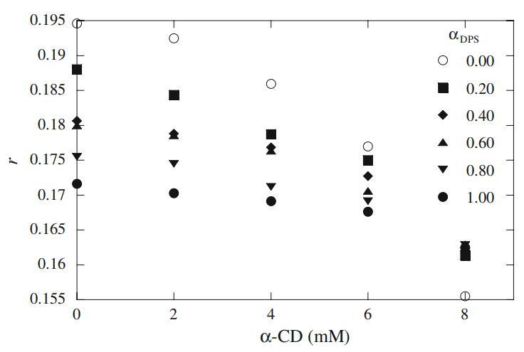 根據方程式15,我們計算了在不存在和存在α-CD的情況下當前二元混合物的膠束組成(X1)。圖9顯示了混合膠束(X1)和體積摩爾分數(α1)中表面活性劑的組成。從圖9可以得出結論,在αDPS=0.2時,混合膠束中DPS的組成接近40%。存在α-CD時的X1值始終低于水的X1值。這種行為可能反映出α-CD通過降低其結合最強的表面活性劑的量來改變成分(見Ka值)。一般來說,CDs不與膠束相互作用,但CDs可能通過與溶液中的表面活性劑相互作用影響膠束的組成,從而改變膠束的平衡和組成。熒光各向異性為了研究混合膠束中兩種不同組分的行為,我們還使用RB作為熒光探針進行了偏振熒光測量。這種探針在膠束介質中已經得到了很好的表征[33]。探針熒光發射的去極化程度是其激發態壽命期間旋轉擴散的度量。熒光各向異性(r)通過Perrin方程與探針周圍的粘度相關,如下[34]: