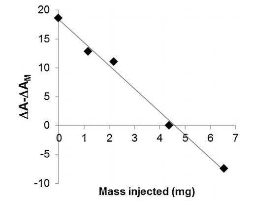 脂質(zhì)體(不同濃度)對BSP蛋白的作用也如圖5所示。脂質(zhì)體在進(jìn)入亞階段前與精漿接觸。隨著脂質(zhì)體中濃度的增加(曲線M/SP+C1至C4),BSP蛋白吸附引起的表面積增加逐漸延遲并減少。當(dāng)含量達(dá)到4.37 mg(C3)時(shí),界面上仍有少量BSP蛋白摻入,1600 s時(shí)出現(xiàn)肩部。在最高濃度(C4)下,未觀察到BSP蛋白摻入,分子面積的變化甚至比對照曲線更負(fù),表明膜組分在亞相中輕微溶解。因此,脂質(zhì)體作用于BSP蛋白的方式與LDL相同。最有趣的比例似乎介于C3和C4之間。根據(jù)確定面積變化與脂質(zhì)體注射磷脂質(zhì)量之間相互作用的曲線計(jì)算得出(圖6)。注射26.6 mg BSP的最佳質(zhì)量為4.6 mg,即PC:BSP比為0.16(w/w)。