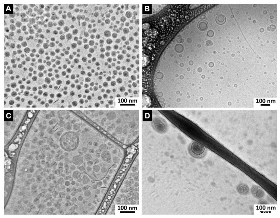 圖7。(A)低密度脂蛋白,(B)脂質(zhì)體,(C)低密度脂蛋白和精漿(精漿中的比例為0.17 mg PC/mg BSP蛋白質(zhì))和(D)脂質(zhì)體和精漿(精漿中的比例為0.16 mg PC脂質(zhì)體/mg BSP蛋白質(zhì))的冷凍電鏡圖像。