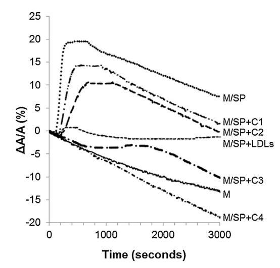 圖5。注入(…)后,由單層(M)覆蓋并在不含(-)額外分子的緩沖液上形成的界面的相對表面積隨時(shí)間的變化SP(26.6±1.5 mg蛋白質(zhì))、SP(26.6±1.5 mg蛋白質(zhì))和不同濃度(··-)C1、(·-)C2的脂質(zhì)體的混合物,(·-)C3和(·-)C4(分別為1.17±0.02 mg、2.18±0.02 mg、4.37±0.02 mg和6.55±0.02 mg脂質(zhì))和(---)LDL(4.6 mg PC)和SP(26.6±1.5 mg蛋白質(zhì))的混合物。氣溫是34度?C在空氣-緩沖器接口處。表面壓力保持在25 mN/m。