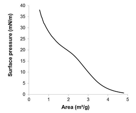 通過傳播精漿在空氣/緩沖液界面形成的單層的表面壓力面積(?–A)等溫線(n=3,標(biāo)準(zhǔn)偏差在0-18.9 mN/m范圍內(nèi)不超過1.5 mN/m,在18.9-38 mN/m范圍內(nèi)不超過1.2 mN/m)。
