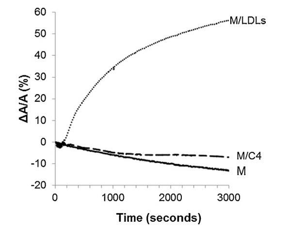 圖4。單層(M)所覆蓋的界面的相對表面積隨時(shí)間的變化,該單層(M)以25 mN/M的速度壓縮,并在不含任何額外分子(-)的緩沖液上形成,(…)LDL(4.6 mg PC)和(-)脂質(zhì)體C4(含4.8 mg PC)。氣溫是34度?C在空氣-緩沖器接口處。