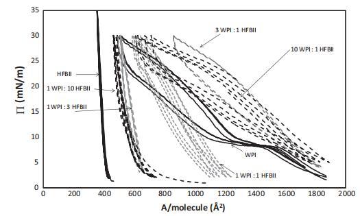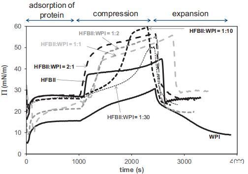 圖1。純蛋白質系統WPI(右)和HFBII(左)以及口糧WPI:HFBII為10:1、3:1、1:1、1:3和1:10的混合系統的表面壓力等溫線。