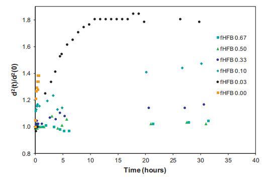 氣泡尺寸隨時間的相對增加如圖9所示,表示為d2(t)/d2(0)。考慮到環境充氣樣品的泡沫穩定性,對于純HFBII系統,在本實驗期間未發現平均氣泡尺寸的顯著變化,表明幾乎不可能發生任何歧化。在純WPI的情況下,可以發現氣泡尺寸急劇增加,表明對歧化的穩定性較差。在混合情況下,隨著fHFBII的增加,我們可以看到氣泡尺寸穩定性增加的趨勢。我們可以粗略地說,當fHFBII<0.2時,氣泡大小的初始演化在很大程度上取決于WPI。然而,當fHFBII>0.2時,HFBII的存在控制泡沫穩定性。這與在朗繆爾槽中觀察到的初始氣泡大小和吸附層的趨勢非常一致。