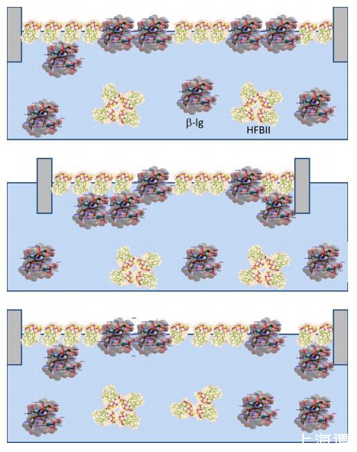 圖7。重復壓縮和膨脹后HFBII:WPI混合層結構形成示意圖。請注意,乳清蛋白的主要成分BLG僅在此處顯示。壓縮:BLG的一部分從表面排出,形成一個子層。膨脹:BLG的一部分停留在亞表層,而另一部分可能重新吸附到主層。頂面存在HFBII的凈濃度。