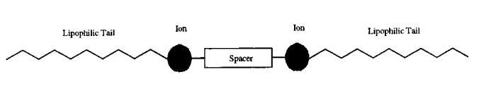 我們寫的雙子座表面活性劑到底是什么?雙子座的排列方式如下所示,而不是像傳統的表面活性劑那樣,將一個單一的烴尾連接到一個離子或極性頭基上。