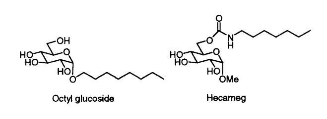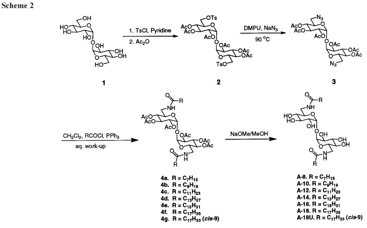 我們的第一個驚喜是發(fā)現(xiàn)A系列海藻糖雙子座不溶于水。例如,A-12、A-14和A-16(指鏈長的數(shù)字)在1毫升溫水中旋轉(zhuǎn)2毫克時會留下沉淀物。即使在70°C的溫度下,A-10也會在這種處理過程中形成渾濁的懸浮液。A-8在室溫下的可溶濃度僅為1-2 mM(根據(jù)動態(tài)光散射,在該濃度下,會形成膠束大小的聚集體)。天真地說,人們可能會認(rèn)為a-8的溶解度大得多,因為該分子由六個羥基和兩個酰胺組成。盡管相關(guān)的6-氨基-6-脫氧己糖衍生物需要加熱才能溶解,25許多烷基化單糖(例如,辛基葡萄糖苷和甲基6-O-(N-庚基羰基)-R-D-吡喃葡萄糖苷或下面的“Hecameg”)是水溶性的。然而,A-8并沒有類似的天賦。這里的教訓(xùn)是,用一句老生常談的話來說,我們的雙子座比其各個部分的總和要多(或少)。不管老生常談與否,雙子座的獨特屬性都取決于它。