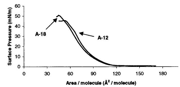圖1。使用表面天平獲得A-12和A-18的壓力-面積等溫線,顯示出在23°C下約120?2的提升面積。圖為每種表面活性劑10次掃描的平均值。