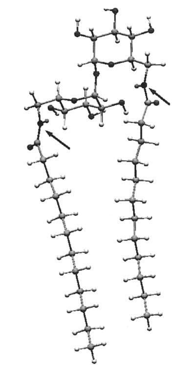 計算首先將海藻糖插入宏模型程序42,并對結(jié)構(gòu)進(jìn)行琥珀色能量最小化。從使用琥珀色*力場的25000個構(gòu)象搜索中,我們選擇了能量最低的構(gòu)象,該構(gòu)象恰好與報告的X射線結(jié)構(gòu)重疊。43,44接下來,該結(jié)構(gòu)中的6-和6′-羥基被乙酰氨基取代。在模擬的水環(huán)境中,用AMBER*再次進(jìn)行了25000次構(gòu)象搜索。然后乙酰基被十二烷基取代,然后對生成的a-12雙子座進(jìn)行了另一次搜索。結(jié)果表明,整個構(gòu)象由酰胺羰基和相鄰葡萄糖環(huán)的2-羥基之間的兩個分子內(nèi)氫鍵控制。氫鍵導(dǎo)致兩條全反式鏈彼此擺動約95°。A-12的固態(tài)紅外光譜證實了這種相互作用,該光譜顯示1646 cm-1處有羰基帶,而Hecameg的羰基帶為1700 cm-1,單體葡萄糖類似物的羰基帶為1698 cm-1。25由于這種構(gòu)象會不切實際地排除分子內(nèi)疏水締合,而且在任何情況下,羰基氫鍵位點的溶劑可能會淹沒在水中,我們故意不允許-CdO氫鍵,并重新計算。通過這種方式,我們得到了圖6。可以看到,一條鏈上大約有八個碳與其伙伴鏈的碳并排排列。N/N距離僅為7.4?,整體分子形狀為“管狀”。用另一種方式說,糖的頭基延伸的距離不比兩條鏈的寬度大多少,就像人們預(yù)期的一種易于堆積成雙層的化合物那樣。45因此,正如前面從實驗數(shù)據(jù)得出的結(jié)論,海藻糖更像是一個統(tǒng)一的頭基,而不是一個可以有效隔離鏈的長間隔基。