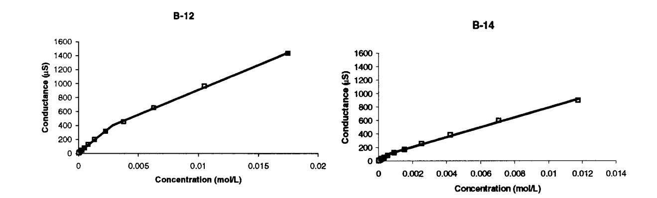 圖5。圖中給出了B-12和B-14臨界膠束濃度,該濃度由電導(dǎo)-濃度曲線中的斷裂點確定。每個點代表23°C下的單個電極讀數(shù)。