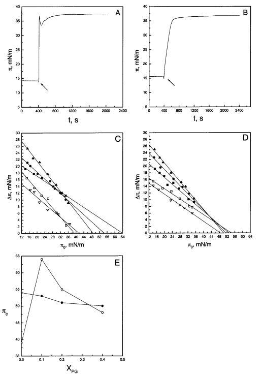 圖1:將時間蛋白B和L插入脂質單層。在初始表面壓力(π0)分別為14.6和15.5 mN/m的情況下,在SOPC/POPG(XPOPG)0.2)單層下方注射顳蛋白B(面板a)或顳蛋白L(面板B)后,表面壓力隨時間的增加而增加。肽(0.3μM最終濃度)的添加用箭頭標記。表面壓力增量(?π)將0.3μM顳蛋白B(圖C)或顳蛋白L(圖D)添加到亞相中導致的脂質單分子膜的數量表示為初始表面壓力(π0)的函數。SOPC中POPG(XPOPG)的含量分別為0(0)、0.10(9)、0.20(b)和0.40(2)。還顯示了將肽插入具有Xchol)0.1(3)的SOPC膜中。圖E顯示了πc的值,分別作為滲透時間蛋白B(O)和時間蛋白L(B)時XPOPG的函數。每個數據點代表三次測量的平均值。標準偏差在0.1和0.8 mN/m之間變化,為清晰起見,未顯示。
