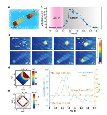 研究人員研制的驅(qū)動薄膜中具有光熱效應(yīng)極好的氧化石墨烯(GO)材料,可將光能轉(zhuǎn)換成熱能,當光照射漂浮于水面上的驅(qū)動薄膜時,薄膜會產(chǎn)生一定的溫度并傳遞給周圍的液體,造成局部水溫升高進而影響水的表面張力。