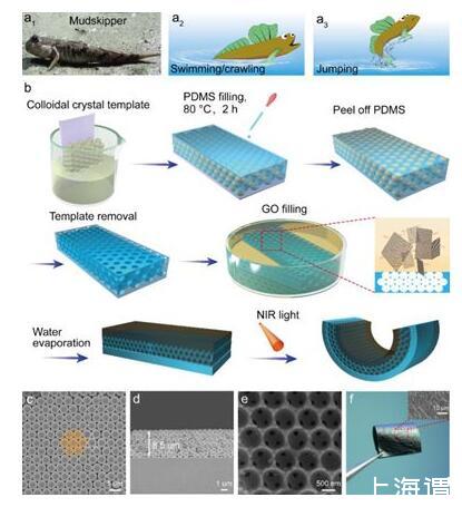 彈涂魚具有陸地爬行、水中游泳、泥中跳躍的獨特特征,是一種具有多場景適應(yīng)能力和多功能驅(qū)動行為的魚類。受彈涂魚啟發(fā),中國科學院蘭州化學物理研究所固體潤滑國家重點實驗室表面與界面研究團隊開發(fā)了一種能對各種環(huán)境做出響應(yīng)的智能光驅(qū)動器。