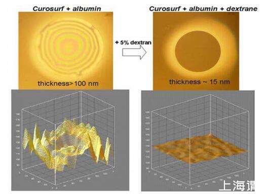 通過Curosurf和白蛋白將PEG 10000包含到混合FFs中不會(huì)改變膜類型,并且FFs仍然厚且不均勻。相反,葡聚糖的加入導(dǎo)致了顯著的變化:觀察到薄膜變薄且穩(wěn)定的黑色薄膜(h=15 nm),類似于在沒有白蛋白的情況下通過Curosurf獲得的薄膜(圖3)。