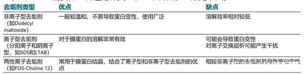 去垢劑的選擇:去垢劑別名表面活性劑、乳化劑、肥皂等等,分為離子型、非離子型和兩性離子型三類。去垢劑是同時具有親水性和疏水性基團的雙極性分子,能夠使磷脂雙分子層解體并釋放膜蛋白,并且為去膜狀態(tài)下的膜蛋白提供穩(wěn)定的疏水環(huán)境。去垢劑也需要篩選合適的種類和濃度,各自優(yōu)缺點見下圖。