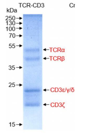膜蛋白復(fù)合體TCR-CD3交聯(lián)后進行凝膠過濾分子篩層析,進行SDS-PAGE實驗,發(fā)現(xiàn)得到比較純的復(fù)合體。