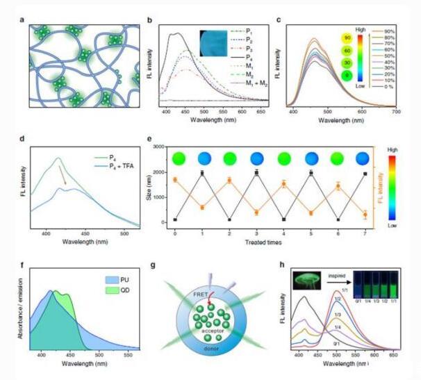 而當去除三氟乙酸后,熒光和粒徑又會恢復,并能進行多次循環(huán)。這種構(gòu)象介導的變形現(xiàn)象和變色現(xiàn)象,與水母在呼吸時隨著膨脹和收縮,所表現(xiàn)出的熒光轉(zhuǎn)變行為十分相似。