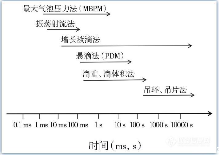 由于對DST時間范圍界定的不同,可運用的測量手段也有所不同。王建坤等認為,在達到靜態表面張力前的表面張力變化都可算是DST,這個時間范圍以幾毫秒到幾小時計??捎肳ilhelmy吊片法、DuNouy吊環法、滴重法、滴體積法、懸滴法、最大氣泡壓力法測定DST。