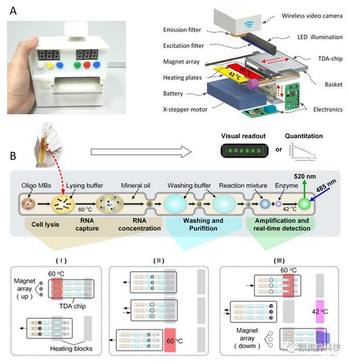 分子診斷是新興的檢驗(yàn)醫(yī)學(xué)領(lǐng)域。隨著熒光定量PCR的推廣,基因檢測技術(shù)在臨床醫(yī)學(xué)中得到了廣泛應(yīng)用。盡管如此,現(xiàn)有核酸分析平臺的一些不足之處還是限制了分子診斷技術(shù)的推廣:1)場地要求嚴(yán)格,試劑準(zhǔn)備、核酸提取和擴(kuò)增需要分別在獨(dú)立房間內(nèi)進(jìn)行,極大限制了該技術(shù)在醫(yī)療資源有限條件下的開展;2)采用離線式分析,操作復(fù)雜、分析周期較長,不利于應(yīng)對突發(fā)性事件;3)現(xiàn)有的熒光定量PCR方法多是針對單一指標(biāo)檢測設(shè)計(jì),對于多重基因檢測無論是操作繁瑣程度還是測試成本均是難以接受的。