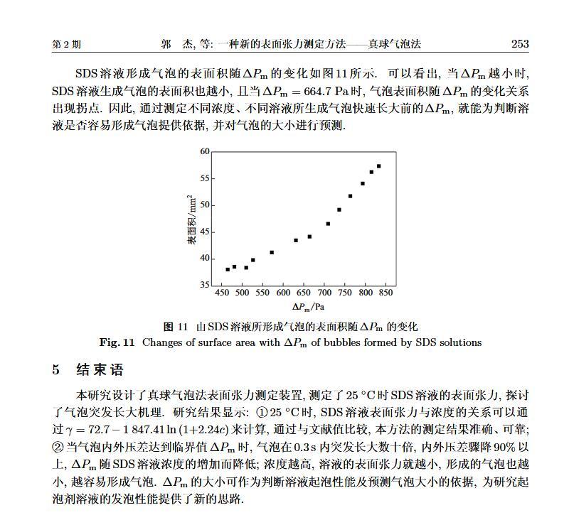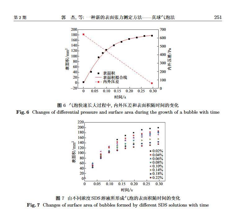 設(shè)計(jì)了一個(gè)新的表面張力測(cè)定裝置,通過(guò)實(shí)時(shí)測(cè)定液膜氣泡的半徑及其內(nèi)外壓差來(lái)獲得被測(cè)液體的表面張力。該測(cè)定液體表面張力的方法簡(jiǎn)稱為真球氣泡法(real sphere bubblemethod,RSBM)。對(duì)十二烷基硫酸鈉(sodium dodecyl sulfate,SDS)溶液的表面張力進(jìn)行了測(cè)定,結(jié)果與文獻(xiàn)值吻合,且測(cè)定裝置的絕對(duì)精度為98.2。通過(guò)檢測(cè)到的液膜氣泡突然長(zhǎng)大所需要的最大壓差值及其表面積隨時(shí)間的變化過(guò)程,定量分析溶液起泡難易程度及氣泡大小的關(guān)系。