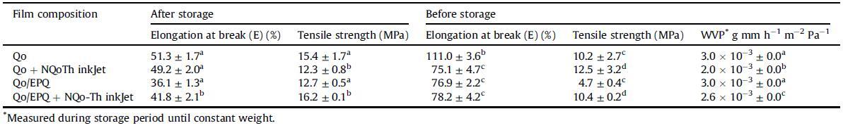 表4儲存30天后通過4層熱噴墨摻入和未摻入NQoTh的薄膜的機械性能和水蒸氣滲透性能。不同字母表示顯著差異(p<0.05)。