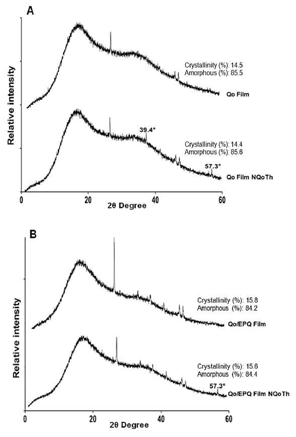 圖4.(A)Qo薄膜控制和Qo NQoTh 11薄膜和(B)Qo/EPQ薄膜控制和Qo/EPQ NQoTh薄膜的X射線衍射曲線和結晶度(%)。