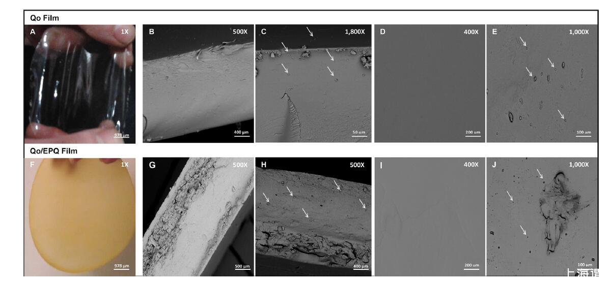 Qo和Qo/EPQ的印刷膜示于圖3A和F。圖3B示出了Qo膜的橫截面,圖3G示出了EPQ/Qo膜的橫截面。Qo膜具有均勻、柔軟、光滑、連續的結構,具有良好的完整性和孔隙。相比之下,混合膜具有帶有孔隙和裂縫的異質結構。Qo-乳清蛋白薄膜(Kurek、Galus和Debeaufor,2014年)和Qo-明膠薄膜(Kurek等人,2012年;Rivero、García和Pinotti,2009年;Torres、Aimoli、Beppu和弗雷利希,2005年)。這些作者將這些由碳水化合物和蛋白質混合物制備的薄膜的異質結構歸因于干燥過程(溶劑前沿的遷移)。Qo/EPQ薄膜的干燥時間是Qo薄膜的1.8倍,表明水分子通過混合薄膜的擴散速度較慢。此外,混合物的pH值(pH 3.8)接近藜麥蛋白的等電點(Abugoch,Romero,Tapia,Rivera,&Silva,2008),這可能會引發復雜的凝聚和某些蛋白質組分的沉淀,導致Ferreira等人描述的熱力學不相容性。(2009),當乳清蛋白和Qo的混合物被酸化以獲得混合膜時,他觀察到了這種現象。