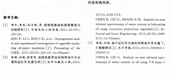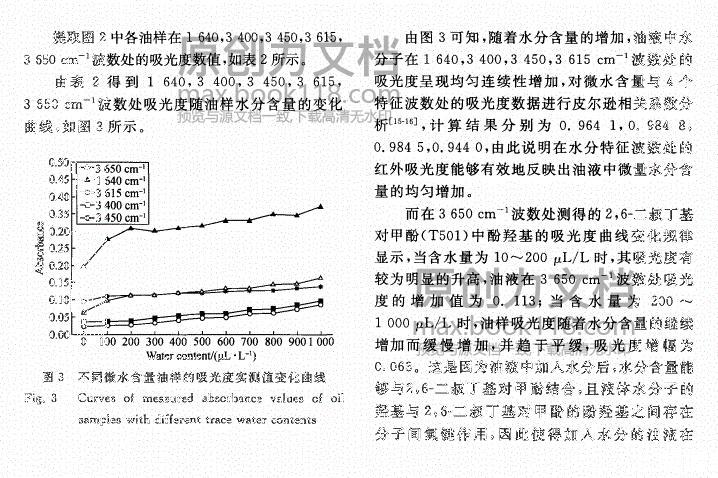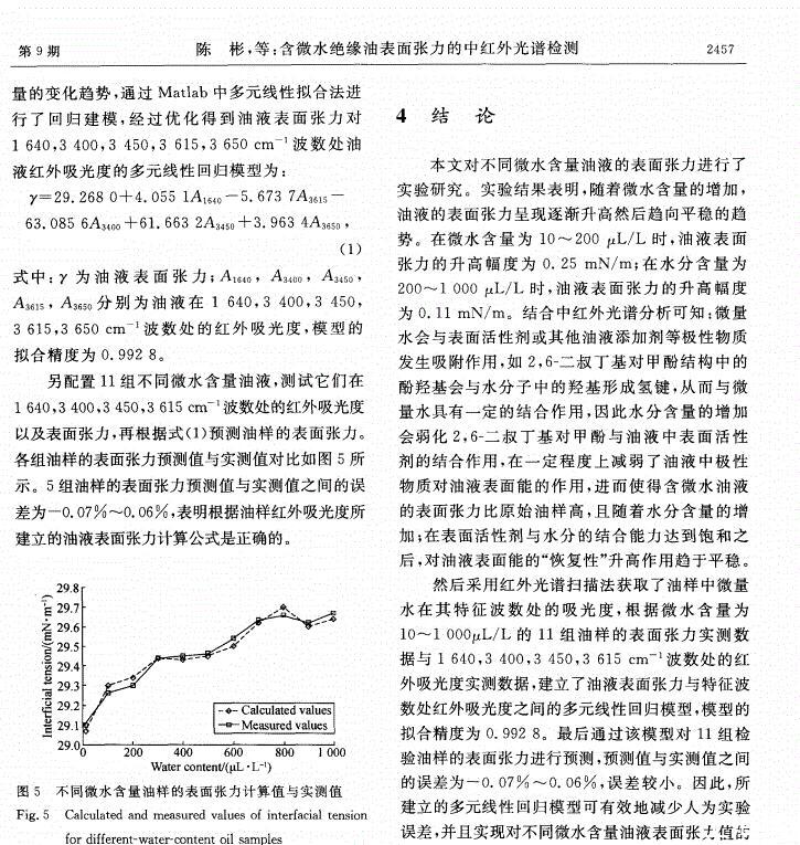 【摘要】:為了有效監控絕緣油的運行狀態,采用定量分析方法探討了微量水分對絕緣油表面張力的影響規律。通過配制不同微水含量的絕緣油樣,對每組油樣進行表面張力測試,然后對油樣進行紅外光譜掃描,獲取了油樣中水分在特征波數處(1 640,3 400,3 450,3 615cm-1)的吸光度值。分析了油液中2,6-二叔丁基對甲酚(T501)等添加劑對油樣表面張力變化規律的影響。結果表明:油樣中水分含量與水分特征吸光度值之間有較好的相關性(相關系數分別為0.964 1,0.984 8,0.984 5,0.944 0),油樣表面張力和1 640,3 400,3 450,3 615,3 650cm-1波數處油樣吸光度值的變化亦均呈現良好的正相關性。建立了油樣表面張力與特征波數處油樣吸光度值的多元線性回歸模型,擬合精度為0.992 8;根據模型得到的表面張力計算值與實際測量值誤差為-0.07~0.06%,吻合性較好。文中的實驗可為含微水絕緣油的表面張力檢測提供理論支撐。