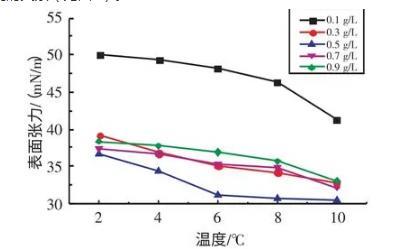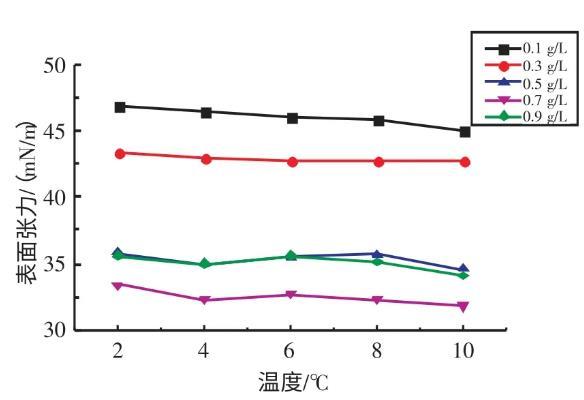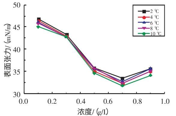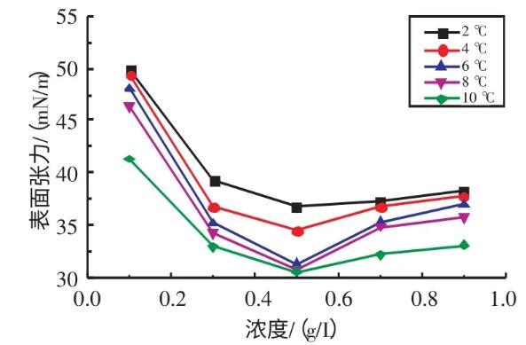 2.2.1不同溫度下十二烷基苯磺酸鈉溶液表面張力與濃度的關(guān)系實(shí)驗(yàn)研究了在溫度為2、4、6、8、10℃條件下,SDBS溶液的表面張力與濃度的關(guān)系(見(jiàn)圖3)。由圖3可知,當(dāng)濃度在0.1~0.7 g/L時(shí),隨著SDBS溶液濃度的升高,其表面張力逐漸減小;當(dāng)濃度在0.7~0.9 g/L時(shí),隨著SDBS溶液濃度的升高,其表面張力逐漸增大。當(dāng)SDBS溶液濃度為0.7 g/L時(shí),其表面張力取得最小值。
