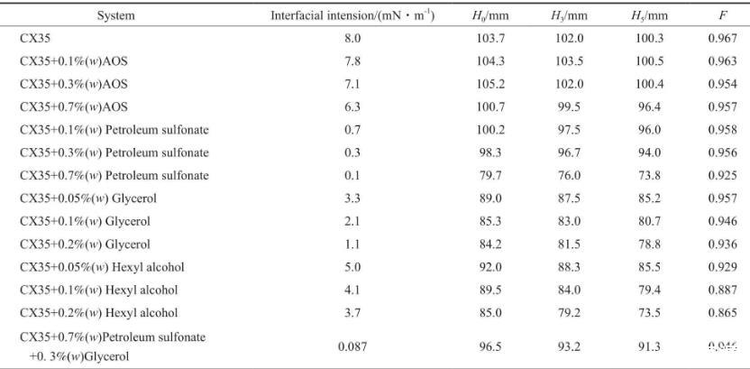 CX35雖具有降低油水界面張力的能力,但加入CX35后,油水界面張力仍大于10-1mN/m數(shù)量級。離子型表面活性劑與醇混合可降低油水界面張力,但醇會影響驅(qū)油劑的起泡性能。不同復(fù)配體系的油水界面張力見表1。由表1可看出,石油磺酸鹽降低界面張力的效果尤為突出。這是因為,石油磺酸鹽含苯環(huán)及類苯結(jié)構(gòu),且苯環(huán)上有疏水碳鏈,與原油中的瀝青質(zhì)和芳烴等物質(zhì)結(jié)構(gòu)相似,故石油磺酸鹽易吸附在油水界面上從而降低油水界面張力。同時,石油磺酸鹽還可提高驅(qū)油劑在空隙中的洗油效率,也可通過乳液產(chǎn)生的阻力提高驅(qū)油劑的波及效率。在m(CX35)∶m(石油磺酸鹽)∶m(甘油)=1∶0.7∶0.3的條件下得到的ZX35的起泡高度可達(dá)到95 mm以上,穩(wěn)泡能力達(dá)到0.946。