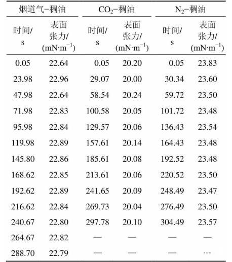 由于煙道氣在原油中具有一定的溶解度,油滴形成后,煙道氣會向原油中擴散、溶解,一直持續到油滴被煙道氣飽和。為了檢測氣體向原油中溶解、擴散對表面張力的影響,對煙道氣?稠油系統的動態表面張力進行測定。圖1所示為120℃和4 MPa下測量的煙道氣?稠油動態表面張力,其中煙道氣組成為80%N2+20%CO2(摩爾分數),并與CO2?稠油和N2?稠油的表面張力進行對比。由圖1可以看出動態表面張力的變化可以分為2個階段:第1個階段為波動階段,在氣體擴散的初始階段,動態表面張力存在一定的波動,約100 s,說明氣體向稠油中擴散會持續一段時間;第2個階段為平衡階段,氣體?稠油的表面張力波動很小,幾乎是一個常數,在相同的溫度和壓力下,CO2?稠油的表面張力最小,N2?稠油的表面張力最大,煙道氣?稠油的表面張力介于二者之間,表1所示為前300 s稠油與不同氣體作用表面張力的實驗值。