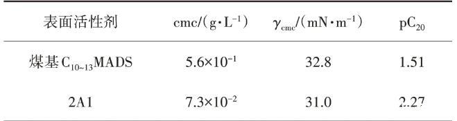 由表1可以看出,2A1的cmc低于C10~13MADS,即形成膠束的能力更強(qiáng),這是由于2A1的親水性低于C10~13MADS,疏水作用強(qiáng),有利于形成膠束。2A1的pC20值大于煤基C10~13MADS,說明2A1在去離子水溶液中降低溶液表面張力的效率高于C10~13MADS。對(duì)于碳?xì)滏溞捅砻婊钚詣瑲?液界面處的—CH3密度對(duì)其表面活性起著很重要的作用,—CH3密度的增大有利于溶液表面張力的降低,同時(shí)γcmc值也逐步降低。由表1可以看出,煤基C10~13MADS的γcmc大于2A1,這是由于2A1是采用四聚丙烯得到的支鏈?zhǔn)樵现苽涞?,其疏水鏈的—CH3密度大于煤基C10~13MADS。