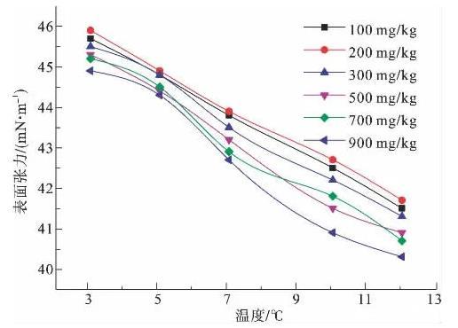 圖7為100、300、500、700、900、1 200 mg/kg濃度下,本實驗自行合成的離子液體[HMIPS]Ss溶液的表面張力隨溫度變化示意圖。在低溫區(qū)間內(nèi)300 mg/kg溶液的表面張力曲線最低,說明該濃度的溶液表面活性最強。在所測溫度范圍內(nèi),整體上表面張力曲線遵循隨溫度升高而表面張力降低的一般規(guī)律,但相差不大,同一條曲線3℃和12℃表面張力值相差0.9~1.1 mN/m。