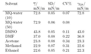 下表列舉了幾種廣為人知的溶劑的表面張力數據來闡述了Kibron傳感器的準確性和精確性,每種溶劑都連續測定5次并且利用常規的統計學方法來分析相關數據。對表面張力的均值進行了一個比較,結果和文獻值是相一致的。