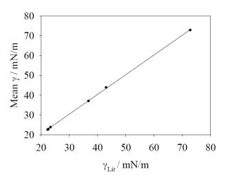 對上述數據進行了線性擬合(下圖),相關系數可以達到0.999,證明了在整個表面張力范圍內Kibron傳感器的極好的準確度。